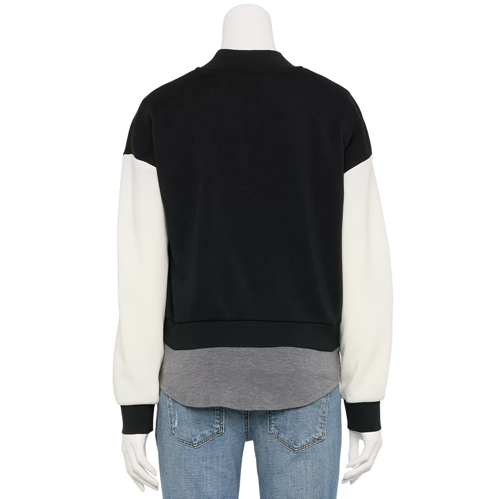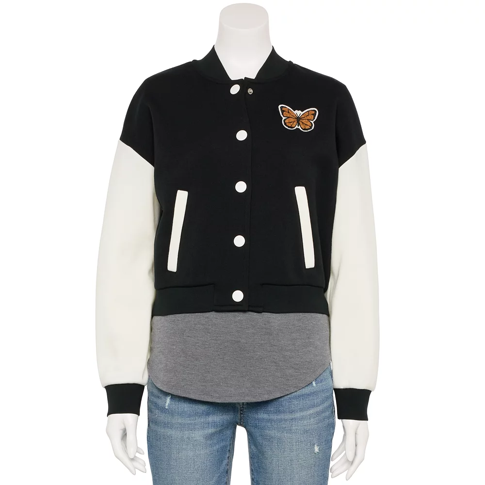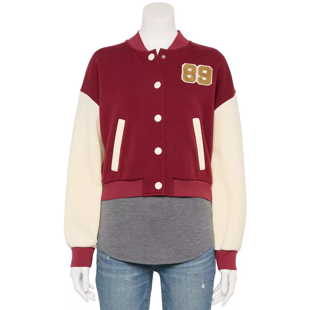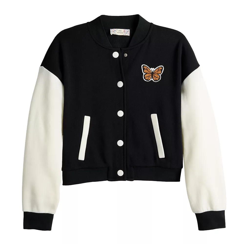 Being stylish has never been easier! With this juniors’ Pink Republic varsity colorblock jacket you’re sure to make an impression.