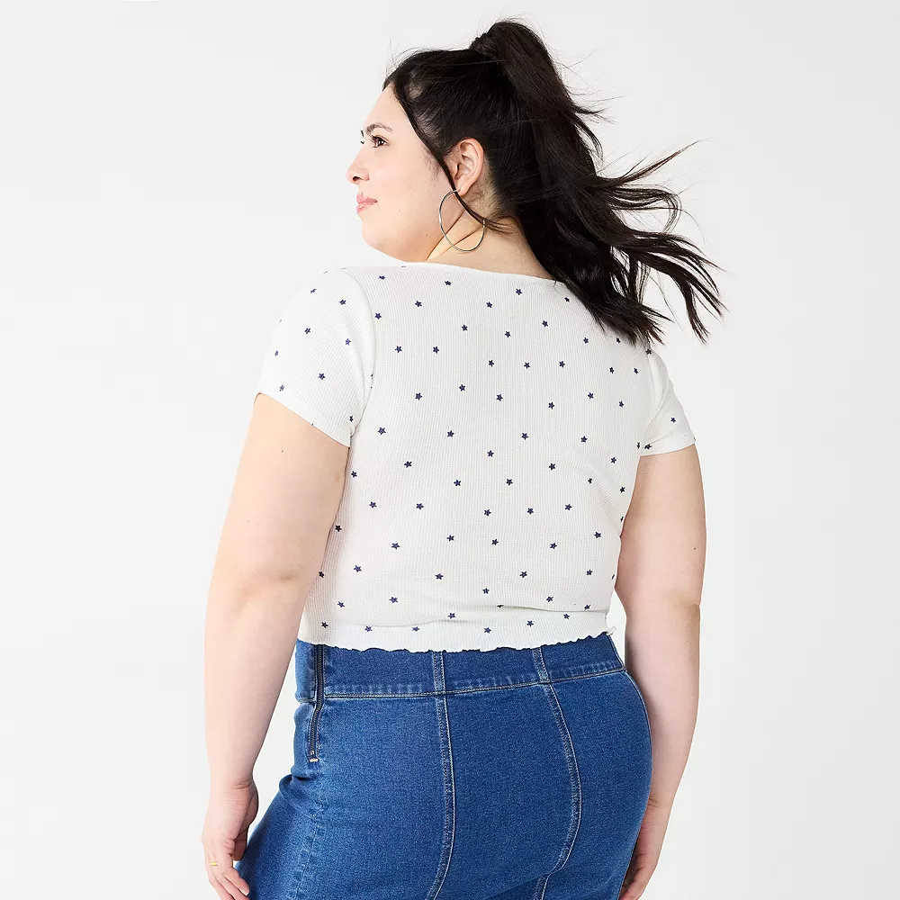Front lace-up detail adds a delightfully charming touch to this juniors’ short sleeve top from SO.