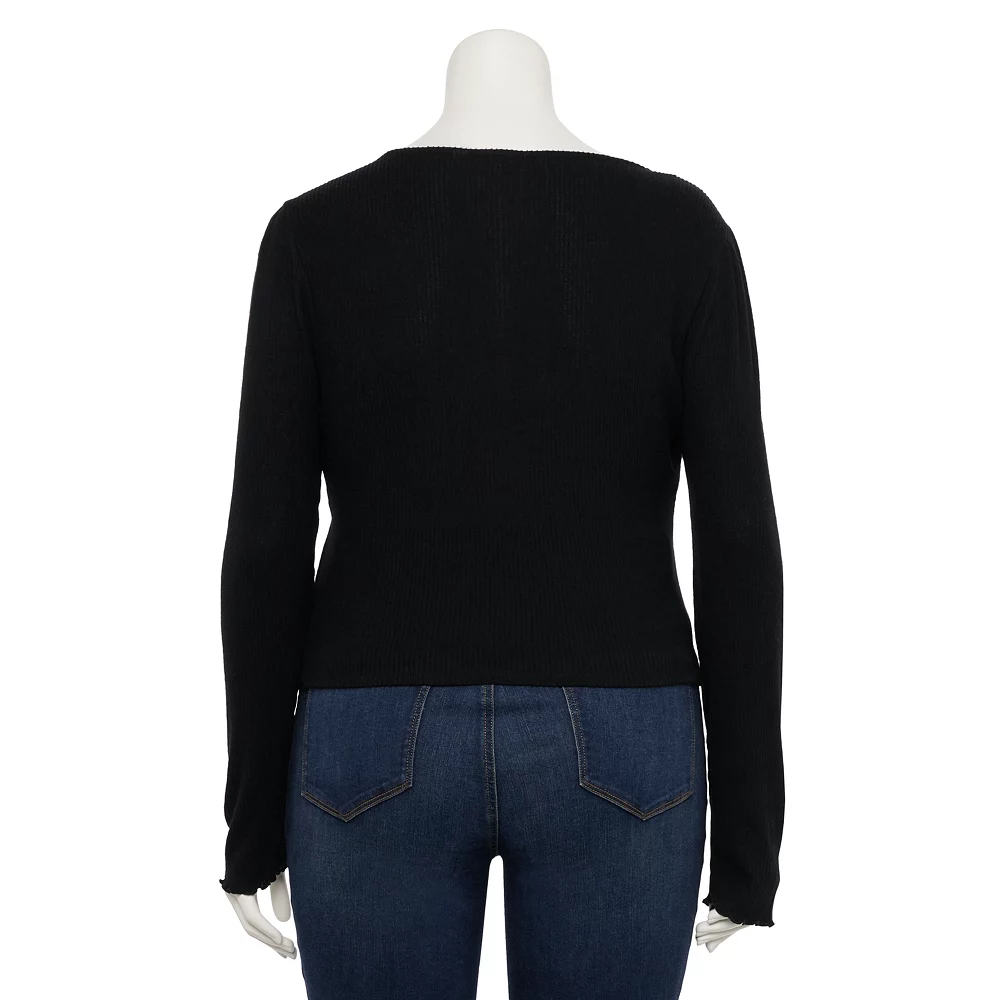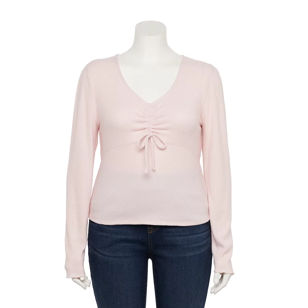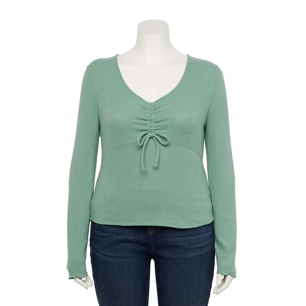 For an effortlessly modern look, this juniors’ cinched front SO V-neck top is a must-have.