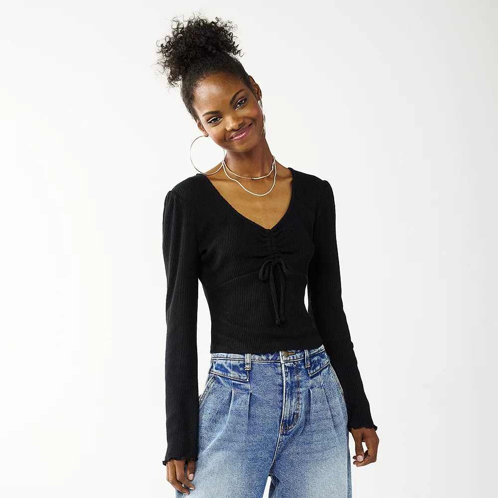For an effortlessly modern look, this juniors’ cinched front SO scoopneck top is a must-have.