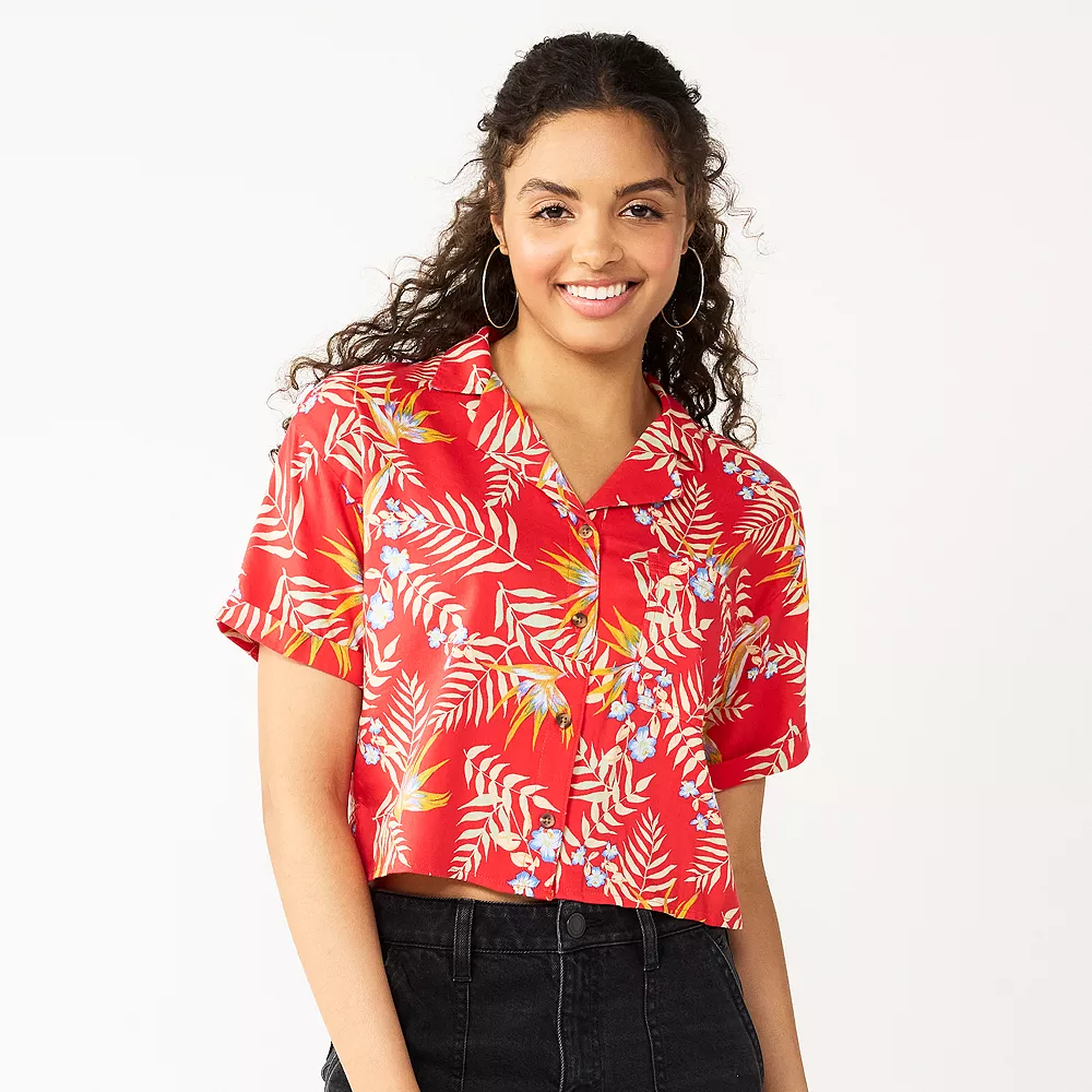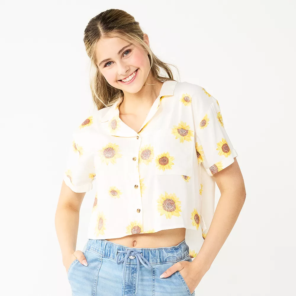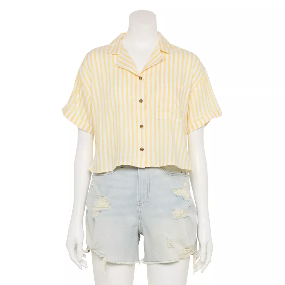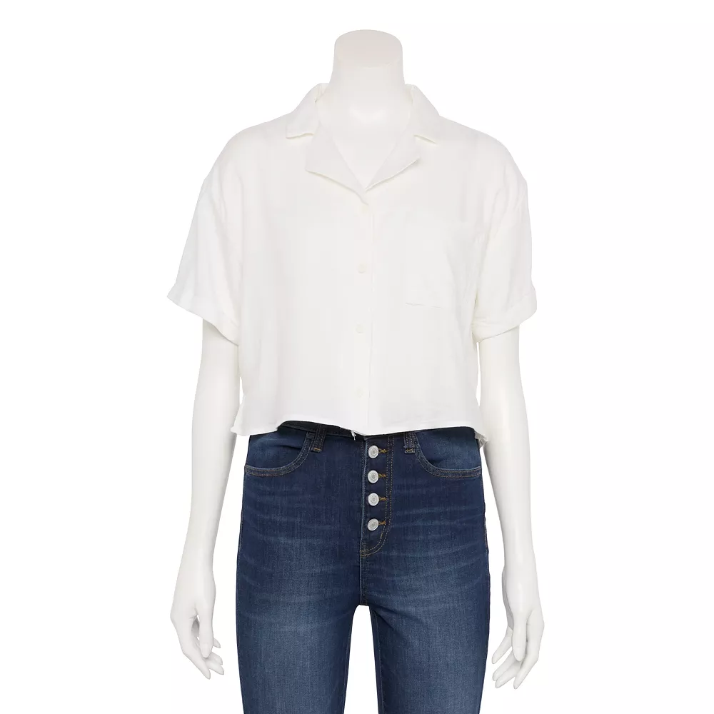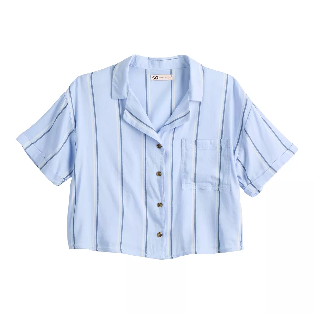 This juniors’ cropped button-front shirt from SO is the perfect addition to any casual wardrobe.