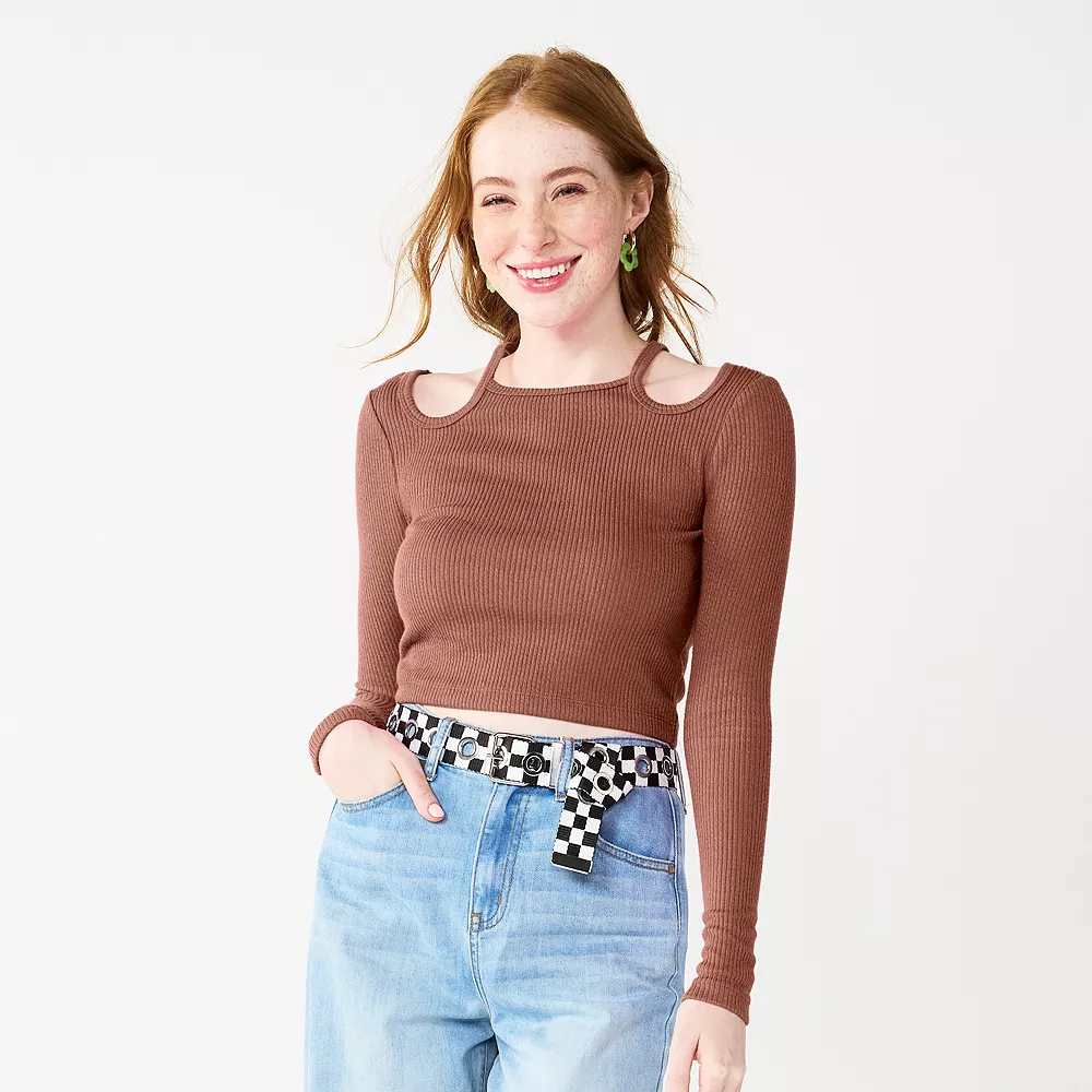 A cropped fit and cutouts at the shoulder make this juniors’ top from SO standout!