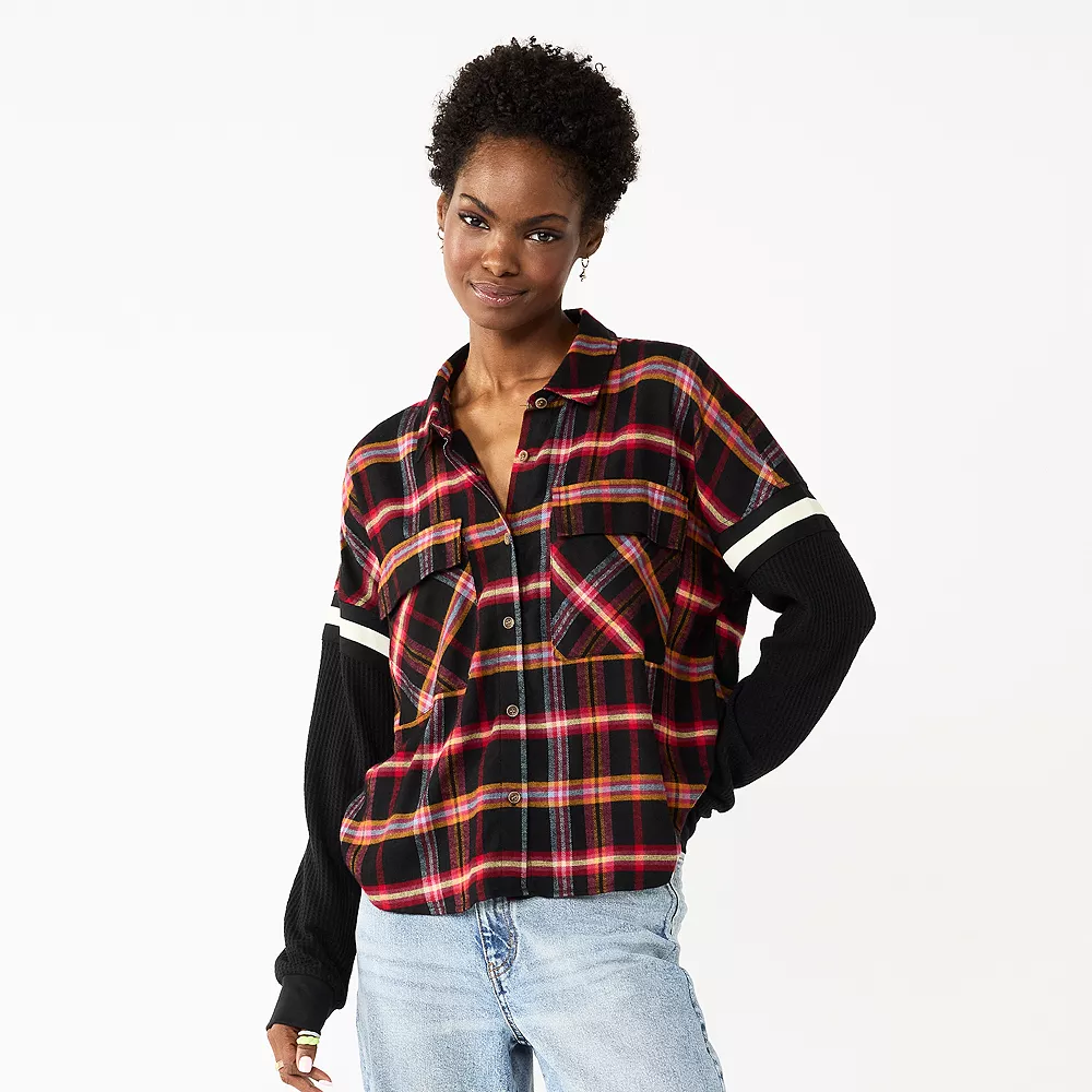 This flannel juniors’ SO top goes from soft knit sleeves to a cute flannel print, making this top as unique as it is stylish.