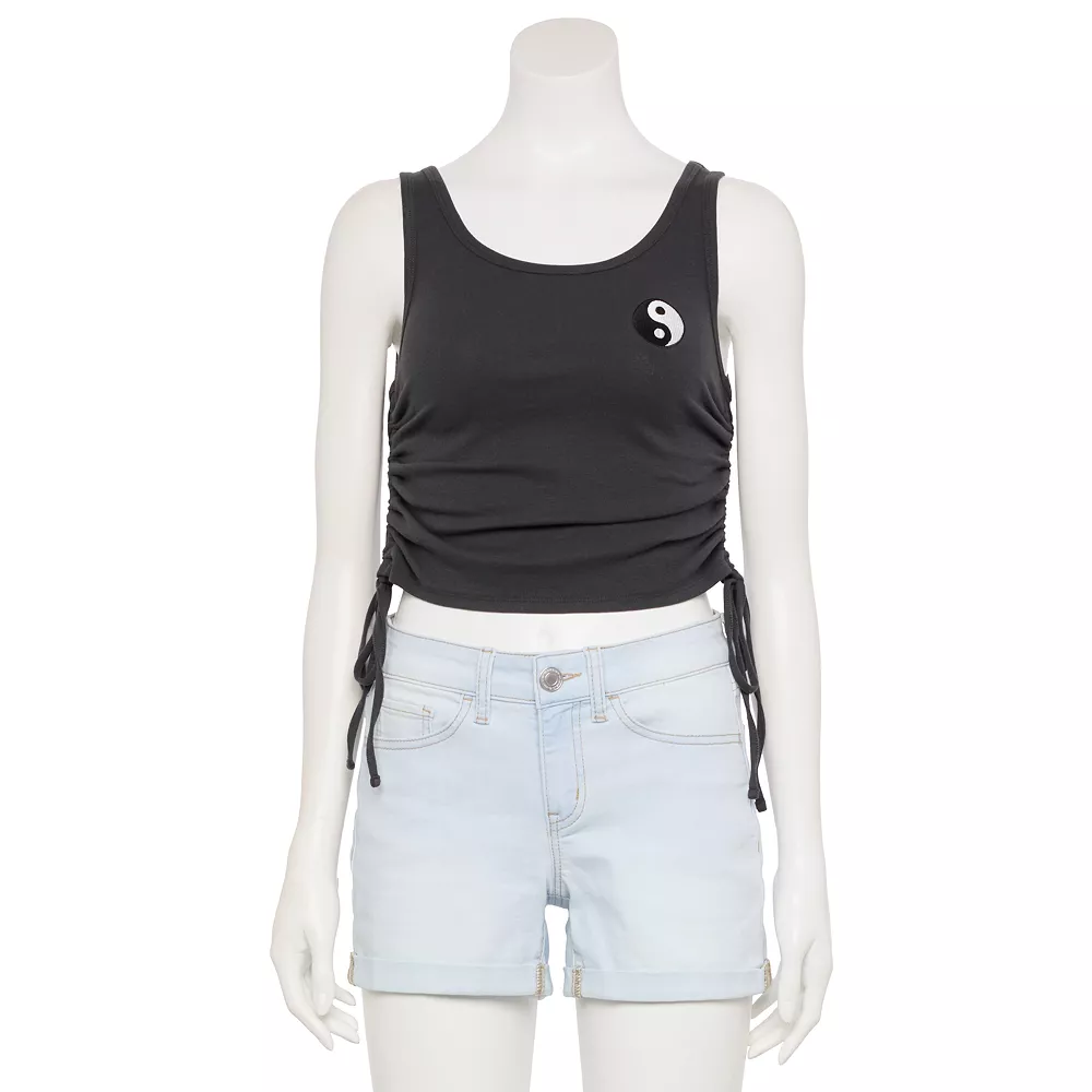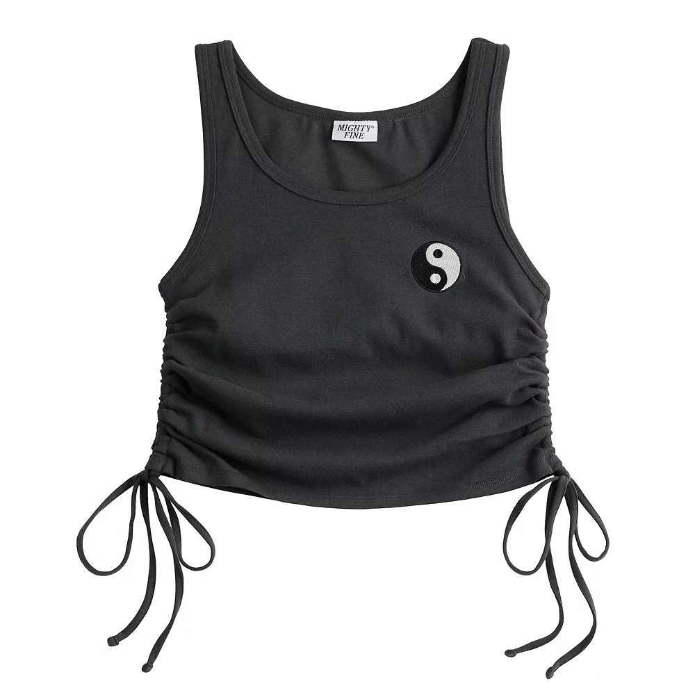 Juniors’ Yin Yang Embroidered Side Cinch Ribbed Tank Top